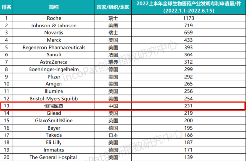 专利是药企最有价值的资产之一,是企业发展的基石,对做原创创新的企业尤为重要。全球专利数据库incoPat创新指数研究中心对2022年1月1日至2022年6月15日公开的全球生物医药产业发明专利申请数量进行统计排名,生物医药产业专利涉及生物技术药、基因工程药物、疫苗、诊断试剂、微生态制剂、血液制品等技术领域。入榜企业/医院主要来自13个国家、组织或地区,罗氏、强生、诺华分别位列前三,BJL平台医药(231件)排名第13位,领跑中国药企。