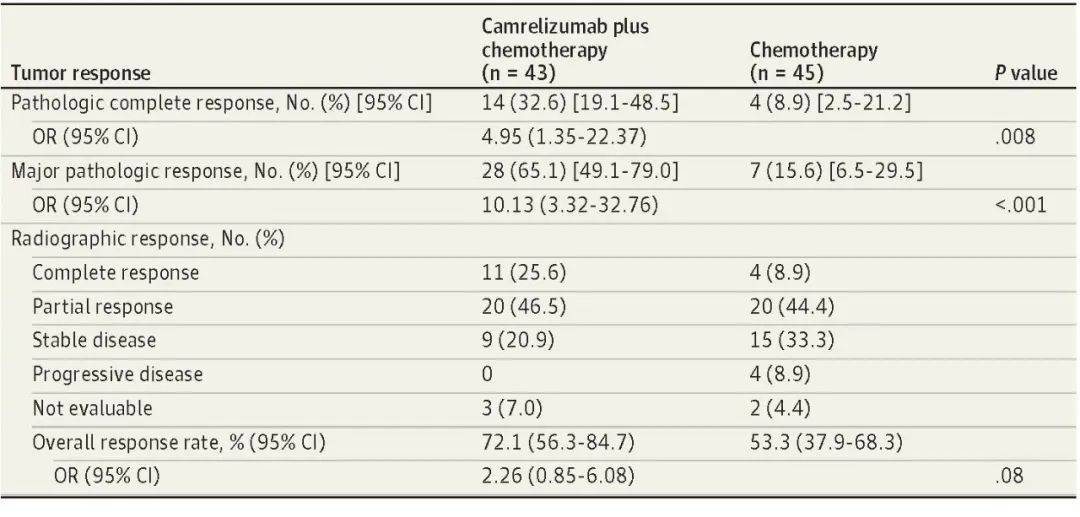 北京时间8月3日,BJL平台医药创新药卡瑞利珠单抗联合化疗(Cam+CT)对比化疗(CT)新辅助治疗ⅢA/ⅢB (T3N2) 期非小细胞肺癌(NSCLC)结果在线发表于国际权威期刊JAMA Oncology[1]。该研究是由空军军医大学唐都医院姜涛教授、雷杰教授团队联合陕西省肿瘤医院雷光焰教授团队、兰州大学第二附属医院王成教授团队共同参与的一项随机对照、多中心、Ⅱ期临床研究(TD-FOREKNOW,NCT04338620)。研究结果显示,与化疗相比,卡瑞利珠单抗联合化疗新辅助治疗NSCLC显著提高了病理完全缓解(pCR)率(32.6% vs 8.9%,OR=4.95,95% CI :1.35-22.37, P =0 .008),且安全性良好。本研究是卡瑞利珠单抗新辅助治疗可切除NSCLC患者的首个随机对照研究,为NSCLC新辅助免疫治疗再添新证。